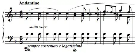 It opens quietly on the dominant of the F major key, with repeated Cs in both the left and right hands. This quickly progresses to a melody and development with the performance instruction sotto voce (quietly). This section fades out with several repeated As in the right hand.