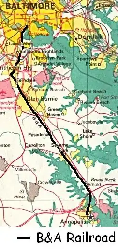 The railroad started as a steam powered line running from a station in Annapolis, on Bladen Street just south of St. John's College,[4] crossing the wide Severn River estuary on a long timber trestle, and on to Clifford on the B&O line, where it used the B&O tracks to terminate at Camden Station in Baltimore. Because the A&B Shortline created an almost straight line southeast from Baltimore it snatched much of the Baltimore-Annapolis trade away from the Annapolis, Washington & Baltimore Railroad on which passengers had to change trains at Odenton or Annapolis Junction.[5]
