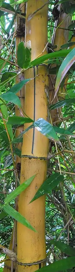 Bambusa vulgaris forms moderately loose clumps and has no thorns.[9] It has lemon-yellow culms (stems) with green stripes and dark green leaves.[10] Stems are not straight, not easy to split, inflexible, thick-walled, and initially strong.[11] The densely tufted culms grow 10–20 m (30–70 ft) high and 4–10 cm (2–4 in) thick.[5][12] Culms are basally straight or flexuose (bent alternately in different directions), drooping at the tips. Culm walls are slightly thick.[13] Nodes are slightly inflated. Internodes are 20–45 cm (7.9–17.7 in). Several branches develop from mid-culm nodes and above. Culm leaves are deciduous with dense pubescence.[9] Leaf blades are narrowly lanceolate.[13]