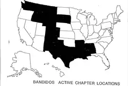 In response to the establishment of the Hells Angels in Ontario, the Chatham chapter of the Loners merged with the Bandidos, initially as probationary members on 22 May 2001 before becoming full members on 1 December 2001.[49] The Loners were sponsored into the Bandidos by the Danish branch of the club, a move that was not sanctioned by the world headquarters of the Bandidos in Houston, Texas, making their extract status within the club somewhat problematic.[50] It was agreed, however, that even though the Danish branch of the Bandidos were responsible for the Canadian branch as their sponsors, the American branch would supervise the Canadian Bandidos.[51]