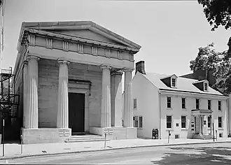 The Bank of Chester County, the first to be built in the county, was then conceived in 1814, located in the Record Office at the intersection of High and Gay Streets in West Chester, Pennsylvania.[3] In 1818, a building on the other side of High Street was bought for the bank – located at present-day 13 High Street, having been built in 1792. Over time, modifications were made to the building in order to suit its purpose. The bank was the main building occupying the lot until a proposal in 1835 resulted in the construction of the Thomas U. Walter building, named for its architect, the new site of the bank after it was built in 1836 and opened in 1837 at a cost of $33,000 at 17 High Street. The stone used to build the bank originated at the Jacobs and Cornog marble quarry in West Whiteland Township. Although the old building's ownership is retained by the bank and is used to store old equipment, it is no longer used, and has been rented to numerous individuals over time, including William Darlington, David Townsend, and William W. Jefferis.[3] Until 1857, the Bank of Chester County was the only one in the county.[2]