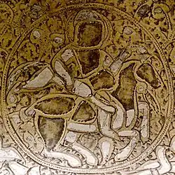 It has decoration depicting human figures both internally and externally, which is characterized by a great diversity of characters, in their clothing, their physical appearance and their postures. According to D.S. Rice, this decoration would be oriented along an axis passing through the silver under the rim of the basin and a characteristic armor.[12] All the figurative motifs are located on a background of plant foliage, where various animals are located. Outside, the decoration occupies the lower part of the basin; it consists of a main register with friezes of characters interrupted by four medallions, bordered by two friezes of running animals, interrupted by four medallions bearing a fleur-de-lys heraldry. Above the upper register, a vegetal pattern ends with lancets. A large inscription in silver takes place on the area remained untouched. A running animal frieze is also present on the edge of the rim.