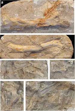 - ^ Paul's estimate of the wingspan and body mass is actually written for Alcione in his book, based on his assumption that Barbaridactylus represents the adult stage of Alcione.[4] However, the 2018 study directly refutes this claim based on the hatchet-shaped deltopectoral crest different from Alcione; the wingspan of approximately 4 m (13 ft) is noted in the supplement of this study which concurs with Paul's estimate.[2]
