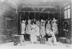 The exaggerated size of some props, particularly the Mercier bottle and the key to Bluebeard's chamber, point to Méliès's wish to emphasize certain details in the complex, sprawling wide shots of the film. In later cinema, when a grammar of narrative film editing became prevalent, such emphasis would often be given using closeups.[1] Similarly, to clarify the film's plot within its spacious format, Méliès drew freely on 19th-century theatrical techniques, including exaggerated mime-based acting, carefully layered groupings of actors, and scenery painted with sharp, high-contrast detail.[1]