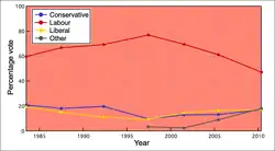 At the 2010 general election, Barnsley Central was Labour's 52nd safest seat,[10] and has, with its predecessor seat of Barnsley been held by the party since 1935. In 2010, the Liberal Democrats and the Conservative Party took second and third places, with only six votes separating them. The British National Party was the only other party to retain its deposit.