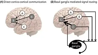 42. ^ Hélie S, Ell SW, Ashby FG (March 2015). "Learning robust cortico-cortical associations with the basal ganglia: an integrative review". Cortex; A Journal Devoted to the Study of the Nervous System and Behavior. 64: 123–135. doi:10.1016/j.cortex.2014.10.011. PMID 25461713. S2CID 17994331.