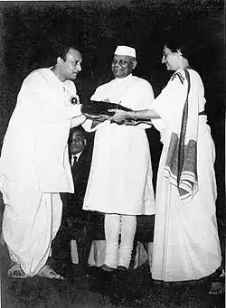 Basanta Chowdhury receiving Bengal Film Journalists' Association – Best Actor Award from then Prime Minister Smt. Indira Gandhi in1966 CE for the movie 'Raja Rammohan'.