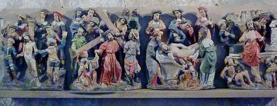 The 15th-century apse, originally flat, replaced three small altars dedicated to John the Baptist, Notre-Dame de Pitié, and Saint Joseph. A polychrome wooden bas-relief from the destroyed Pors An Quen chapel (1900) depicts the Passion of Christ. Two statues, the Virgin of the Annunciation and an angel, form the Visitation group. The northern absidiole has statues of Saint Elizabeth, an angel, John the Evangelist, and Saint Joachim, with a red-and-yellow parasol (restored 2000) and a wooden belfry bearing the basilica's arms, granted in 1899. The southern absidiole features statues of Gabriel, Saint Bernard of Clairvaux, Saint Joseph ("patron of workers"), and the "model of mothers." Eight restored stained-glass windows (1846–1876) by Didron, Fialeix, and Laurent Gzell depict noble families' arms, the Virgin's life, Francis of Assisi, and the Carmelite Order.[5]