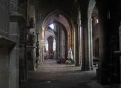 The ambulatory's flamboyant Gothic windows feature flame-like lancets. Sculpted foliage capitals, corbelled supports, and statues adorn the space. Two columbariums include Monsignor Galerne's (parish priest, 1871–1882) with a wooden sculpture above his epitaph, and Monsignor Jean-Marie Robin's, with a Latin inscription noting his 20-year tenure and death in 1865. A southern memorial honors World War I fighters, and Rolland de Coatgourheden's columbarium, possibly his nephew's, depicts him in armor, presented by Charles de Blois to the Virgin and Child, with his arms and those of the Du Parc de Locmaria.[8]