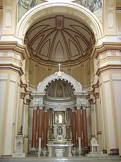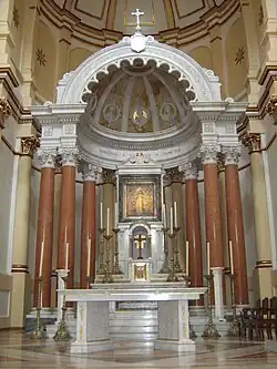 The half dome and columns form a sort of canopy which shelters the altar, church tabernacle, a shrine for the Virgin of Mercy made of green marble and topped by a monogram and a ducal crown, and the throne of the saint which is also decorated and enclosed in frames. In the far part of the altar is a reproduction of the Leonardo da Vinci's The Last Supper in Venetian mosaic.[8]