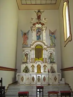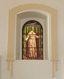 The semicircular entablature rests on the capitals, made up of the architrave, frieze, and cornices. On its east side is a semi-dome decorated with high relief ornaments.[8] In the centre is a shield with the initials "I.H.S.", a monogram of the name of Jesus Christ. The dome is topped with a cross. At the bottom of the semi-dome are five medallions representing the titular saint of the parish, Aloysius Gonzaga, and the Four Evangelists. These medallions are placed on a background of Venetian mosaic.