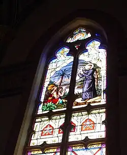 The church has 64 large cathedral glass windows.[2] There are two notable windows in the church. The first is the rose window above the entrances to the church, installed in 1959. It replaced a conventional church window on which the framework had become deteriorated. An Indian motif was selected in recognition of many local Indian tribes that inhabited this area 150 years earlier.