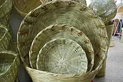 Basketry made with reeds and rushes is done in various regions in the state of Oaxaca, such as the Central Valleys, the Miahuatlán Valley, the Mixtec region and Tehuantepec, mostly baskets for the transport of merchandise.[4] Most of these wares originally were for carrying merchandise to market, along with petates and tenates. From the mid 1980s, Oaxacan basketry, especially in the Central Valleys as incorporated Asian elements into their designs. Amador Martinez went to China to learn bamboo basketry. When he returned, he taught other artisans what he had learned. The new forms have also been incorporated in the basketry workshops of the prisons in Tlacolula and Ocotlán. The new forms and decorations have had steady levels of increasing acceptance in the region.[1]