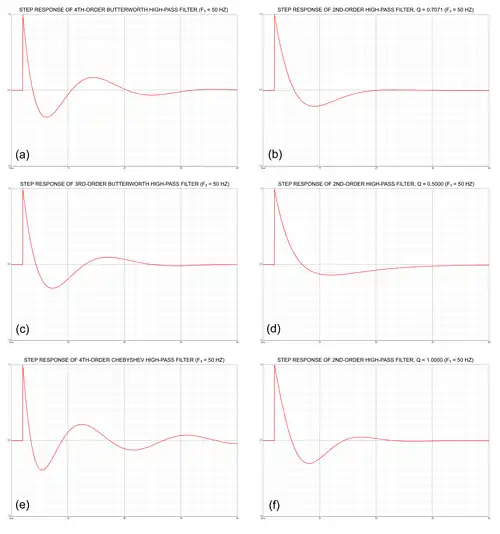 Step responses of various high-pass filter functions, each with a −3 dB cut-off frequency equal to 50 Hz. The step response of a standard B4 vented-box low-frequency alignment is depicted in (a), while that of a standard B2 (Q = 0.7071) closed-box low-frequency alignment is depicted in (b).