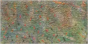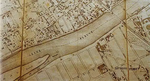 The spot depicted is just short of four miles from the centre of Paris. In fact, the figures on the river-bank are not in the commune of Asnières, but in Courbevoie, the commune bordering Asnières to the west. The bathers are in the River Seine. The slope forming most of the left hand side of the painting was known as the Côte des Ajoux, near the end of the rue des Ajoux, on the north bank of the river. Opposite is the island of la Grande Jatte, the east tip of which is shown as the slope and the trees to the right, and which Seurat has pictorially extended beyond its actual length. The Asnières railway bridge and the industrial buildings of Clichy are in the background. Locations such as this one were sometimes shown on French nineteenth century maps as Baignade (or ‘bathing area’).[2][3]