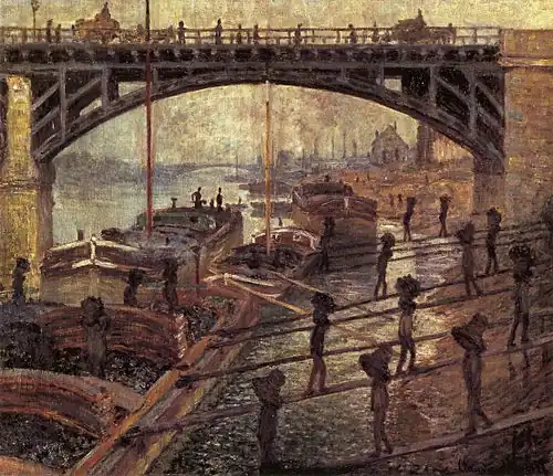 At the time of this painting, urban development in Paris was proceeding at a very rapid pace. The population of Paris had doubled from one million in 1850 to two million in 1877, and the population of Asnières had almost doubled in just ten years to reach 14,778 in 1886. The reality of the often unpleasant or dangerous conditions in which industrial workers laboured had already been fully taken on by painters, such as in—for instance—Monet’s painting of 1875, Men unloading coal, which in fact shows the bridges at Asnières as they were almost a decade before Seurat painted them.
