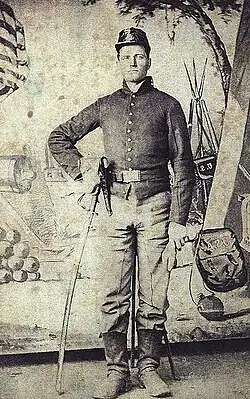 June 1, 1864, Battery E marched to Guntown, Mississippi, where it took part in the disastrous Battle of Brice's Crossroads on June 10. Together with the 9th Minnesota Infantry, the battery initially formed a reserve force deployed near the crossroads itself.[87] Attacked by Confederates under General Forrest on both flanks at once, Colonel William McMillian, commanding the infantry on that portion of the field, ordered Battery E to sweep the Guntown Road with grapeshot and canister.[88] Despite heroic efforts by the 9th Minnesota and other Federal units the Northern army was pushed back, with Col. McMillian ordering Battery E with Battery B of the Second Illinois Light Artillery to hold off the Rebels until the infantry could escape.[89]