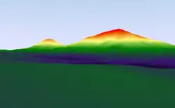 A unique geological feature of Battle Mountain is that the western slope outcrops are composed entirely of alkali feldspar granite, while the eastern slope up to and including the summit is entirely rhyolitic. This provides strong evidence of a theorized lateral explosive eruption event centered on the eastern slope at approximately 704 Ma as proposed by Woolman (2016). Further mathematical geology evidence which supports this theory includes a palaeogeographic reconstruction of the mountain by Woolman utilizing artificial neural networks and Markov chain geostatistical models including period climate condition-based soil erosion rates, Kirkby's hillslope movement evolution equations and recursive biogeochemical soil erosion rates in felsic granitic conditions. The result was the digital reconstruction image shown on the left, indicating what Battle Mountain may have looked like 704 million years ago on the western slope.