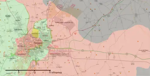 At the beginning of the battle, Aleppo's Kurds formed armed groups, most notably the Saladin Ayubi Brigade, which worked with the opposition. Units of the Kurdish Front, part of the FSA and allied with the Democratic Union Party (PYD), were formed later in 2013. The PYD had poor relations with both sides. Its People's Protection Units (YPG) stayed out of Arab areas and insisted the FSA stay out of the Kurdish area. They did not initially fight the Syrian Army unless attacked.[156] The Kurdish areas in Aleppo mainly came under PYD control.[157] At various points in the conflict, the Kurds joined the opposition against pro-government forces.[78] However, the YPG-controlled neighborhood of Sheikh Maqsood came under a siege by both Syrian government forces and the rebels. In September 2015, the rebels accused the YPG of collaborating with the government and shelling the neighborhood.[158] Between November and December 2015, the conflict between the rebels and US-backed Kurdish-led Syrian Democratic Forces (SDF) in the rest of Aleppo province escalated.[159][160] Truce attempts largely failed to stop the fighting.[161][162] The situation escalated in February 2016, when the SDF followed up on advances by the Syrian Armed Forces, backed by Russian airstrikes, and they themselves took territory north of Aleppo city from the rebels.[163][164]
