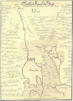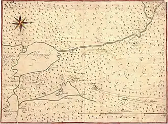 ![]() Map from the 17th century (west is toward the top) over the area around Eda and the lakes Hugn and Bysjön. Source: Krigsarkivet | |||||||