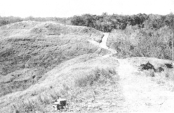 ![]() A U.S. Marine stands near some of the fighting positions on Hill 123 on "Edson's" Ridge after the battle. Edson's command post during the battle was located just to the right of where the Marine is standing. | |||||||