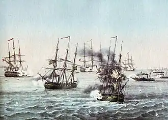 Brommy initially remained outside of Heligoland's waters, hoping to catch Valkyrien if it left the safety of British neutrality.[8] but by around 14:30, three Danish warships—the frigates Rota and Thetis and the steamer Gejser—approached the area to come to Valkyrien's aid. The appearance of the three Danish warships prompted the Germans to withdraw back to port. The Danish ships pursued him, and at around 16:45, Gejser and Valkyrien opened fire on the retreating Germans. Rota and Thetis moved to block the Germans' path back to the Weser, forcing them to divert to the mouth of the Elbe.[9] After Brommy entered the Elbe and arrived at the port of Cuxhaven, the Danish ships laid off the river entrance to prevent him from making another attack on the blockade force.[4] The Danes thereafter reimposed the blockade of the North Sea coast.[10]