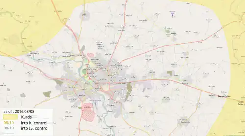 On 7 November, the Peshmerga, backed by coalition airstrikes, launched an offensive from three fronts in the morning to take the town of Bashiqa, which was still held by ISIL and had been surrounded for about two weeks.[216] About 100 to 200 ISIL militants were estimated to be left in the town.[217] In the early afternoon, the Iraqi troops also advanced on the town of Tel Keppe, north of Mosul, besieging the town. The town of Bashiqa was reported to be fully under Peshmerga control, though an ISIL pocket remained under siege in the town until the end of the month.[216][218] On the southern front, Hamam al-Alil was fully captured by pro-government forces, after two days of clearing out the remaining ISIL fighters.[219] In eastern Mosul, the ISOF surrounded the neighborhoods of Karama, Malayyin al-Salasa, Shquq Khazraa, Zahra, Karkuli, Aden and Zahabi. The Iraqi Army's 9th armored division and the 3rd Brigade captured the village of Manarat Shabak, east of the city, and made an incursion into the eastern Mosul neighborhoods of Hay Intisar, Judaydah al-Mufti, and Hay Shaima. Meanwhile, the Iraqi Federal Police captured two villages near Hammam Al-Alil.[216] On 8 November, on the western front, PMU forces were reported to have advanced to a distance of 25 km towards the strategically important Tal Afar military airbase, south of the city of Tal Afar.[220] On 9 November, the ISOF captured the majority of the Intisar district in southern Mosul, while ISIL had reportedly deployed armed child soldiers in Mosul.[221] On 10 November, in eastern Mosul, the Golden Division, as well as elements of the 9th Division, were reported to be regrouping and clearing neighborhoods once occupied by ISIL, as well as screening residents fleeing from Mosul for any militants hiding among them.[222] On the southern front, pro-government forces advanced towards the ancient city of Nimrud.[223]