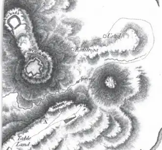 The Nalapani fort was situated on a 500–600-foot (150–180 m) hill that was covered in dense jungle. The approach to the fort was very steep in most directions and the top of the hill, which formed a tabletop feature, was about .75 miles (1.21 km) in length. Its highest point was to the south, where the town of Kalanga was located.[14] The fort was constructed in an irregular shape, having been built to conform with the shape of the ground upon which it was situated, and at the time the British entered the Dun Valley, its walls had not been finished. Upon their arrival, the British found the Nepalese defenders working to improve the fort's defences and raising the height of the walls.[14]