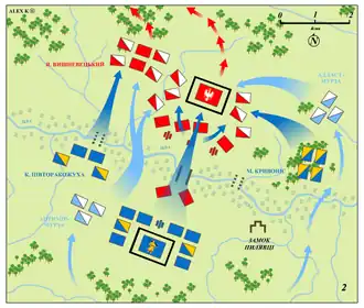 Following several days of minor battles, Khmelnytsky led his army on the morning of 13 September 1648 shouting: “For the faith, brave warriors, for the faith!", killing many Polish cavalrymen as they fled back across the Ikva.[6]: 474  That night, the Polish commanders decided to retreat in corral formation to Starokostiantyniv, but while preparing for this retreat the next day, they would hold their position and fight under Wisniowiecki's command.[6]: 475  However, "rumours began curculating among the troops ... that the commanders had abandoned the camp and taken flight, and fear was turned into wholesale panic".[6]: 475  "Everyone else began to flee, leaving behind wagons, cannon, and all kind of supplies, only the sick and maimed remained", not stopping at Starokostiantyniv, Koniecpolski went to Brody, Ostroróg to Olesko, Zaslawski to Vyshnivets.[6]: 475
