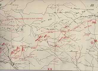 Falkenhayn ordered a counterattack to be carried out on the morning of 3 November in a southeasterly direction to push the EEF off the Beersheba to Jerusalem road, and stop the threatened outflanking of the Ottoman left.[71] Ali Fuad commanding the Ottoman XX Corps assembled the 16th Division and the 3rd Cavalry Division along with part of the 19th Division, which arrived after a four-day march from Tel esh Sheria. However, the late arrival of the 19th Division, which did not begin to arrive until the afternoon, and Chauvel's advance, prevented this Ottoman attack from being launched.[72][i]