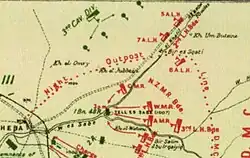 The strategically important height of Tel el Khuweifle not only dominated all the surrounding country, but was also the site of the best water supply in the area.[19][20] However, the EEF had discovered important but scarce water supplies during the day of battle on 31 October. Water was found east of Beersheba by the New Zealand Mounted Rifles Brigade, in the Wadi el Malah, while the 2nd Light Horse Brigade found sufficient water for three brigades in a small wadi north of Bir Hammam, and a good supply in the Wadi Hora.[30] The Auckland Mounted Rifle Regiment also found enough water for a whole brigade in the Bir Salim Abu Irgeig wadi.[31]