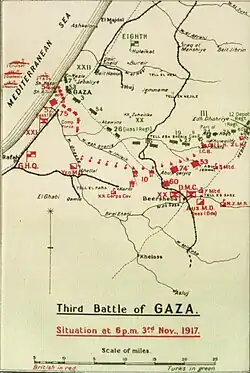 The loss of Beersheba on 31 October stunned the Yildirim Army Group commander and staff.[16]The Beersheba garrison withdrew to the Ottoman defences around Tel es Sheria and northwards to Tel el Khuweilfe, 10 miles (16 km) to the north of Beersheba, and about the same distance east of Sheria, to hold a line stretching from 5 miles (8.0 km) west of the road from Beersheba to Jerusalem. All available reserve units would soon be deployed in the Kuweilfeh area.[17][18][19][20]Here, the Ottoman defenders were able to establish new defences, and the 19th Division was sent from the XXII Corps defending Gaza to reinforce them.[16][b]