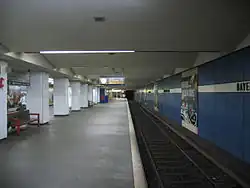 The lower-level U7 portion of the station, built to Rainer G. Rümmler's design in 1968–70 and opened in 1971, also makes use of the Bavarian colours: the walls are clad in blue fibre cement panels with the station name on a white horizontal stripe, and the support columns are white.[8] The ceiling, resembling skylights in industrial buildings, was designed to avoid dazzling train operators;[9] the fluorescent lights are inset in red piping.[8] The lobbies are decorated in contrasting colours: white, red and turquoise. The design resembles that at Eisenacher Straße, also by Rümmler.[9]