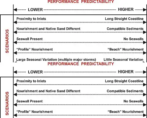 The performance of a beach nourishment project is most predictable for a long, straight shoreline without the complications of inlets or engineered structures. In addition, predictability is better for overall performance, e.g., average shoreline change, rather than shoreline change at a specific location.