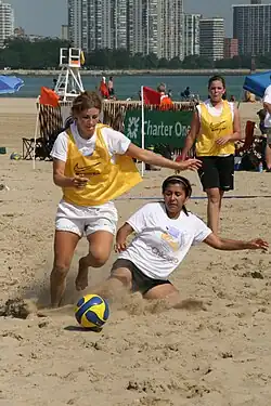 Beach soccer, also known as beach football, sand football or sand soccer, is a variant of association football played on a beach or some form of sand between two teams of five players each.[4]