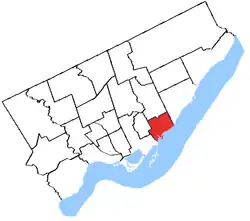 It was created in 1976 with the following boundaries - from Leslie Street where it meets Lake Ontario, the boundary proceeded north along Leslie to Queen Street East. It went west along Queen to Jones Avenue then north along Jones to Gerrard Street East, east along Gerrard and then north on Greenwood Avenue to the city limits. It followed the city limits east to Victoria Park Avenue and then south following Victoria Park back to the lake.