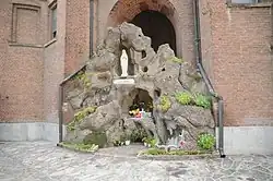 The entrance door, which is from 1981, was built by the sculptor Ferrari of Ponte di Legno.[2] The door is in iron and steel covered with bronze panels: the external part is decorated with representations that represent scenes of life of Mary.[2] In the same year are the six copper panels that are placed inside the building and represent as many biblical scenes: the Baptism of Jesus, The Wedding at Cana, the evangelical beatitudes, the Healing the paralytic at Bethesda and the Samaritan woman at the well.[2]
