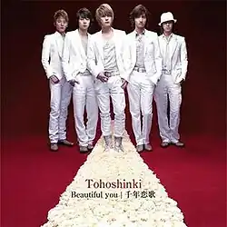 "Beautiful You / Sennen Koi Uta" (千年恋歌, lit. One Thousand Year Love Song) is Tohoshinki's 22nd Japanese single, released on April 23, 2008 shortly before the completion of the T album Japan tour. "Sennen Koi Uta" was used as the opening theme for "The Legend (太王四神記)", a Korean drama that was later aired in Japan. Oricon News predicted that the consecutive releases of the previous single albums as well as the popularity of the historical drama series were expected to boost the sales of the latest single.[1]