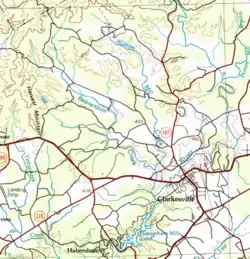 Beaverdam Creek rises in northwestern Habersham County, Georgia, northwest of Clarkesville and south of the Shoal Creek/Upper Soque River sub-watershed, and runs largely in a southeasterly direction for approximately 5 miles (8.0 km), picking up the waters of several small, unnamed branches.[2] Less than 2 miles (3.2 km) east of the intersection of State Route 17 and State Route 115, Beaverdam Creek is joined by Sutton Mill Creek, which originates not far from the source of Beaverdam Creek. The creek then crosses State Route 17/115, and flows into the Soque River just west of Clarkesville, and just north of Habersham Mills Lake.[3]