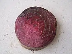 Beet vascular necrosis and rot is a soft rot disease caused by the bacterium Pectobacterium carotovorum subsp. betavasculorum, which has also been known as Pectobacterium betavasculorum and Erwinia carotovora subsp. betavasculorum.[1] It was classified in the genus Erwinia until genetic evidence suggested that it belongs to its own group;[2] however, the name Erwinia is still in use. As such, the disease is sometimes called Erwinia rot today. It is a very destructive disease that has been reported across the United States as well as in Egypt. Symptoms include wilting and black streaks on the leaves and petioles. It is usually not fatal to the plant, but in severe cases the beets will become hollowed and unmarketable. The bacteria is a generalist species which rots beets and other plants by secreting digestive enzymes that break down the cell wall and parenchyma tissues.[3] The bacteria thrive in warm and wet conditions, but cannot survive long in fallow soil.[4][5] However, it is able to persist for long periods of time in the rhizosphere of weeds and non-host crops.[4][6] While it is difficult to eradicate, there are cultural practices that can be used to control the spread of the disease, such as avoiding injury to the plants and reducing or eliminating application of nitrogen fertilizer.