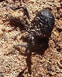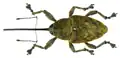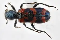 Beetle antennae are primarily organs of sensory perception and can detect motion, odor and chemical substances,[66] but may also be used to physically feel a beetle's environment. Beetle families may use antennae in different ways. For example, when moving quickly, tiger beetles may not be able to see very well and instead hold their antennae rigidly in front of them in order to avoid obstacles.[67] Certain Cerambycidae use antennae to balance, and blister beetles may use them for grasping. Some aquatic beetle species may use antennae for gathering air and passing it under the body whilst submerged. Equally, some families use antennae during mating, and a few species use them for defense. In the cerambycid Onychocerus albitarsis, the antennae have venom injecting structures used in defense, which is unique among arthropods.[68] Antennae vary greatly in form, sometimes between the sexes, but are often similar within any given family. Antennae may be clubbed, threadlike, angled, shaped like a string of beads, comb-like (either on one side or both, bipectinate), or toothed. The physical variation of antennae is important for the identification of many beetle groups. The Curculionidae have elbowed or geniculate antennae. Feather like flabellate antennae are a restricted form found in the Rhipiceridae and a few other families. The Silphidae have a capitate antennae with a spherical head at the tip. The Scarabaeidae typically have lamellate antennae with the terminal segments extended into long flat structures stacked together. The Carabidae typically have thread-like antennae. The antennae arises between the eye and the mandibles and in the Tenebrionidae, the antennae rise in front of a notch that breaks the usually circular outline of the compound eye. They are segmented and usually consist of 11 parts, the first part is called the scape and the second part is the pedicel. The other segments are jointly called the flagellum.[66][69][70]