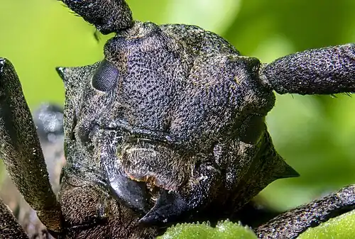 The head, having mouthparts projecting forward or sometimes downturned, is usually heavily sclerotized and is sometimes very large.[7] The eyes are compound and may display remarkable adaptability, as in the case of the aquatic whirligig beetles (Gyrinidae), where they are split to allow a view both above and below the waterline. A few Longhorn beetles (Cerambycidae) and weevils as well as some fireflies (Rhagophthalmidae) [63] have divided eyes, while many have eyes that are notched, and a few have ocelli, small, simple eyes usually farther back on the head (on the vertex); these are more common in larvae than in adults.[64] The anatomical organization of the compound eyes may be modified and depends on whether a species is primarily crepuscular, or diurnally or nocturnally active.[65] Ocelli are found in the adult carpet beetle (as a single central ocellus in Dermestidae), some rove beetles (Omaliinae), and the Derodontidae.[64]