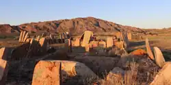 Most visible monuments are about 20 constructively and architecturally unusual megalithic mausolea. As a rule, mausolea are fenced with square or oval layout of two or three stone masonry walls or stone slabs up to 3 tons each encircling a central room and covered by slabs as a perimeter gallery with diameter up to 30 m, and with occasional entrance chamber. The central roof-covered chamber is built with stones and multiple square pillars that support the roof, enclosing a massive sarcophagus. Mausolea are surrounded by ordinary kurgan burials. The cemeteries are close to large settlements extending to 10 ha., with housesbuilt of granite slabs, with pillars and thick walls, connected by corridors.[7]