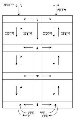 Ekka-dokka (Bengali: এক্কা-দোক্কা),[8] known locally as guti (গুটি),[7] is typically played by women. It is played with either a smaller, broken piece of an earthen pot or flat clay that is rectangular or circular. On the ground, a large box long is drawn and is then divided into six smaller boxes. Every box has a common name, such as ek-er ghor for the first box, dui-er ghor for the second box, and so on up to five boxes, with the last box being known as samundra. The players roll their guti (playing piece) into the first box. After that, the player rotates the guti with their toes into the second box, the second box into the third box, and so on, until it reaches the fifth box. Then, the player rotates the guti back towards their starting position. After completing one round, they roll the guti again, starting at the second box. While rolling the guti, a player sings a melody called ekka-dokka. A player may be eliminated if they choose the incorrect box, leave their playing area, place both of their feet inside the box, or if their guti falls on the line.
