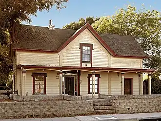 It was designed by local builder George Chalmers in Gothic Revival style.[2] It is a clapboarded balloon-frame L-shaped house built with redwood floor joists and sawn redwood studs. It has split pillars with Tuscan-order capitals, somehow involving fleur-de-lis.[2]