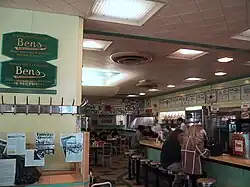 The interior was seemingly unchanged through the years. Its columns and walls were painted in bright greens and yellows with chrome siding, it had a stainless steel edged counter with rows of chrome counter stools, and terrazzo floors, laminate wall covering, and a ceiling with indirect lighting coves.[2] The chairs were bright yellow, orange and green. Walls were covered in photographs of celebrities who had dined at the restaurant; one spot was dubbed "Bens Wall of Fame". Bens employed only waiters, who wore a black bow tie and white buttoned shirt with black dress pants and shoes, along with a white waist apron.