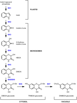 The bx1 gene encodes a protein, BX1, that forms indol from indol-3-glycerol phosphate in the plastid. It is the first step in the pathway and determines much of the natural variation in levels of DIMBOA in maize.[5] The next steps in the pathway occur in the endoplasmic reticulum, also referred to as the microsomes in cell fractionation experiments, and are carried by proteins encoded by genes bx2, bx3, bx4, and bx5.