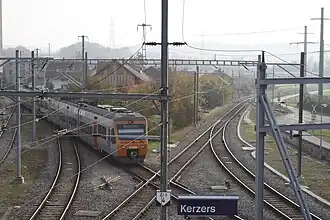 Immediately in front of Kerzers station, the line crosses the Palézieux–Kerzers railway (Broyelinie–Broye line) at a 60° angle. This is the only full crossing of two standard gauge railway lines in Switzerland. The station complex is designed as a Keilbahnhof (literally "wedge station"), a station located between branching tracks.