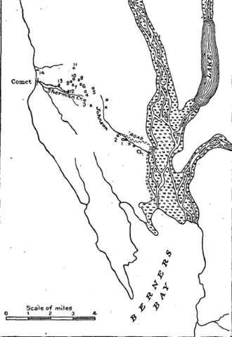 Berners Bay map with locations of key mines: 1-Jualin, 3-Comet, 4-Northern Belle, 6-Eureka, 7-Bear, 8-Kensington, 9-Savage, 10-Horrible, 11-Mellen