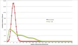 Bespoke portfolios can have very different default correlation characteristics from credit indices with similar distributions of riskiness. Bespoke portfolios almost invariably have numbers of reference securities similar to those of the major credit indices – 100 to 125 reference securities – but bespoke portfolios can include reference securities that have highly correlated default probabilities, either because they are issued by different subsidiaries of the same parent company, because they include closely related but separate companies, or because the bespoke portfolios include much higher concentrations in single industries than occurs in credit indices.[4] Determining the fair default correlations for a bespoke portfolio can be very difficult. The chart on the right shows that differences in correlation can greatly change the probability distribution of defaults and thus change the fair value of any given CDO tranche linked to a particular portfolio.